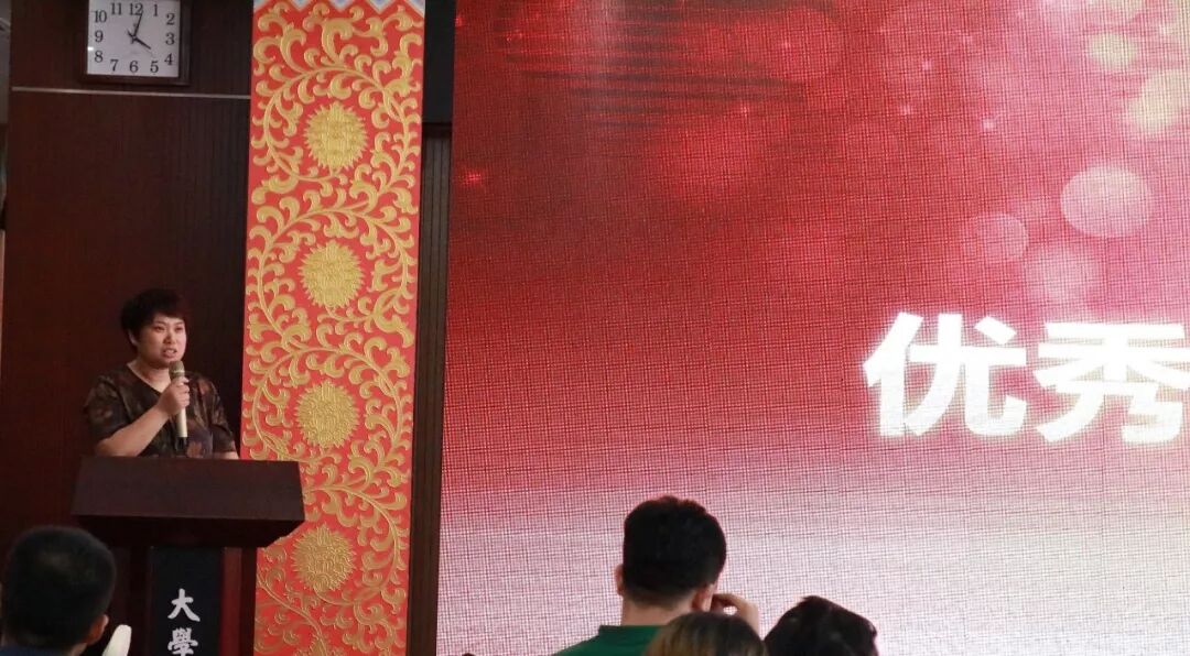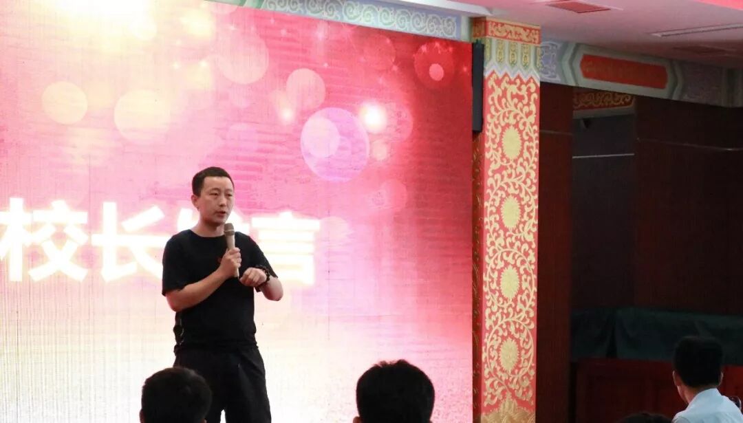 章丘校区王校长上台介绍校区情况,在总部的大力支持下,章丘校区于5月30日正式试营业,目前校区发展状况良好,并希望有更多的人才参与到章丘校区的建设中。